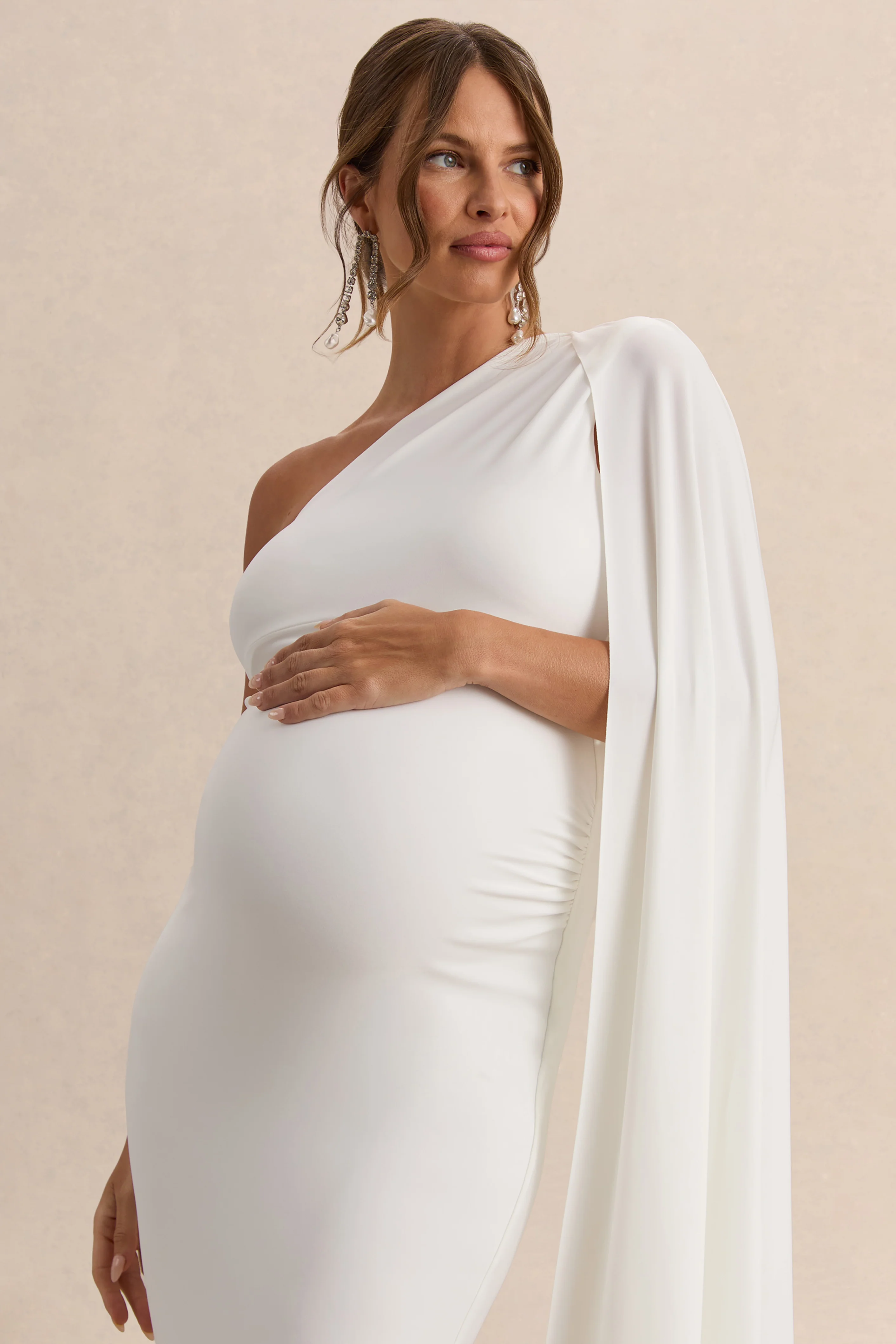 Amaryllis | White Maternity One Shoulder Maxi Dress with Cape Sleeve