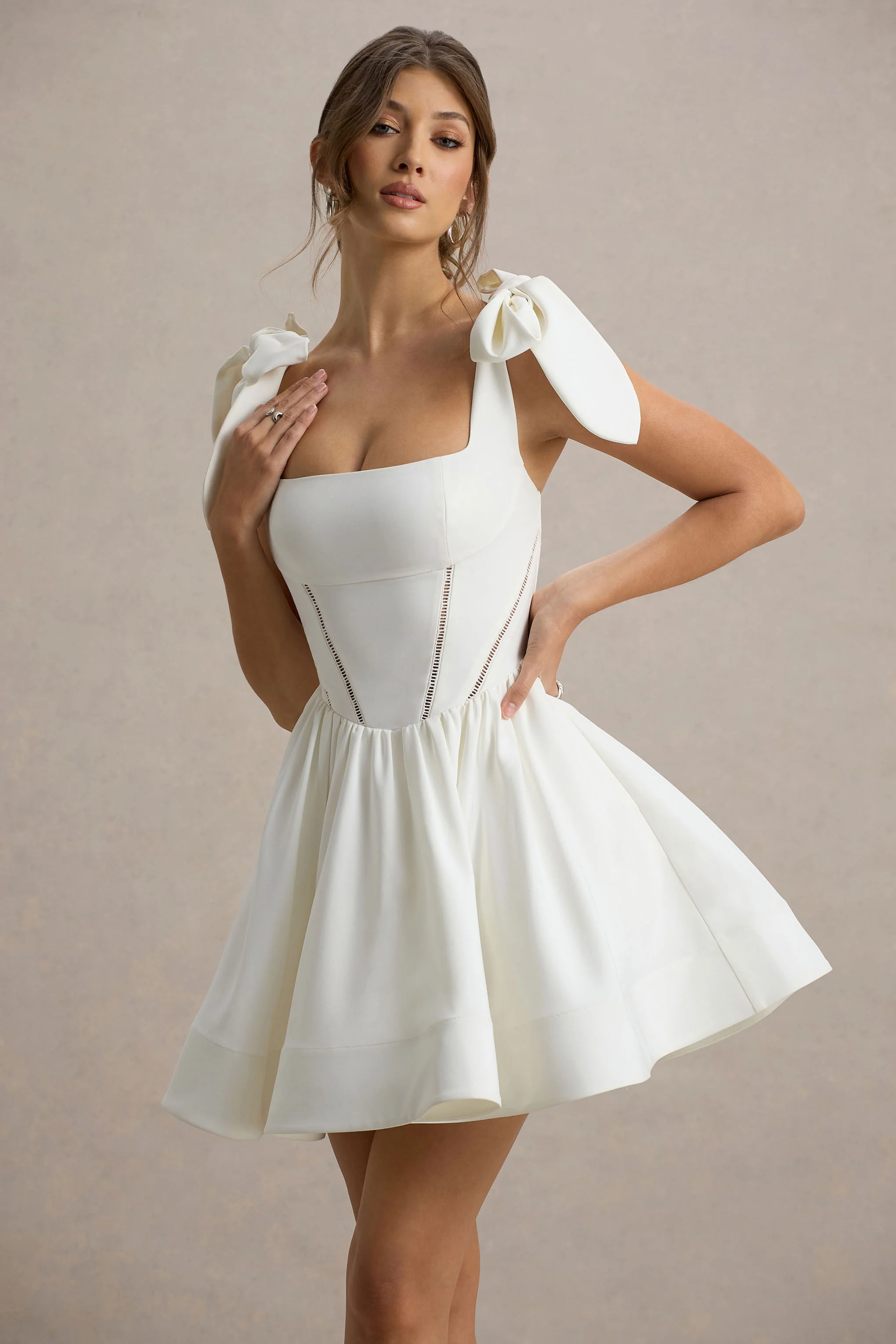 Introducing Mochi, a dreamy mini for every occasion this season. Crafted in our premium stretch crepe and finished in a crisp shade of white, this piece blends flirty flare with elegance. The structured, feminine square neckline is complimented by the romantic tie detail sleeves add a romantic touch. This piece pairs perfectly with gold jewellery and beachy waved hair.